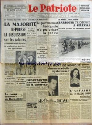 Download PATRIOTE (LE) [No 2002] du 16/03/1951 - UN CONSEILLER MUNICIPAL DESAPPROUVE LE REARMEMENT ALLEMAND ET QUITTE LE RPF - LE TRUQUAGE ELECTORAL DEVANT L'ASSEMBLEE LA MAJORITE REPOUSSE LA DISCUSSION SUR LES SALAIRES ET S'EMPRESSE DE VOTER LE PRINCIPE DU SCRUTIN UNIQUE MAJORITAIRE AVEC APPARENTEMENT - GREVE TOTALE DES ETUDIANTS A PARIS ET EN PROVINCE LA POLICE CHARGE PLUSIEURS BLESSES - LE COUP DE TONNERRE DE BARCELONE PAR ANDRE MARTY - VOICI VENIR PAQUES ET SES BONS CHOCOLATS - LOURDES PERTES DU COR PDF